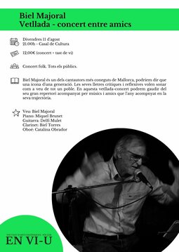 Biel Majoral és un dels cantautors més coneguts de Mallorca, podríem dir que una icona d'una generació. Les seves lletres crítiques i reflexives volen sonar com a veu de tot un poble. En aquesta vetllada-concert podrem gaudir del seu gran repertori acompanyat per músics i amics que l'any acompnyat en la seva trajectòria.