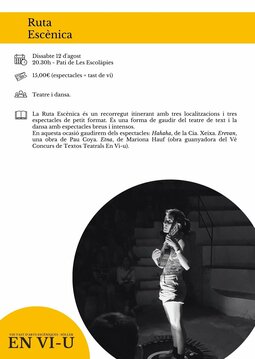 La Ruta Escènica és un recorregut itinerant amb tres localitzacions i tres espectacles de petit format. És una forma de gaudir del teatre de text i la dansa amb espectacles breus i intensos.